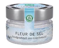 In Salzgärten an der griechischen Küste bilden sich in der Sommersonne die feinen Kristalle unseres Fleur de Sel ("Salzblüte"). Von Hand wird die erste hauchzarte Salzschicht geerntet. Zerreiben Sie das Fleur de Sel einfach zwischen den Fingerspitzen.