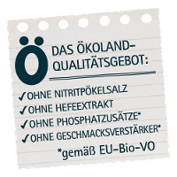 Die Verarbeitung des hochwertigen Bio-Fleisches und der geschmackvollen Bio-Gewürze erfolgt nach strengen Qualitätsrichtlinien. Auf Zusatzstoffe wie z.B. Nitritpökelsalz oder Phosphate verzichten wir aus Überzeugung. Für jedes verkaufte Glas Würstchen Frankfurter Art spendet Ökoland 10 Cent an Mütterzentren von SOS Kinderdorf.Glutenfrei, Laktosefrei.
