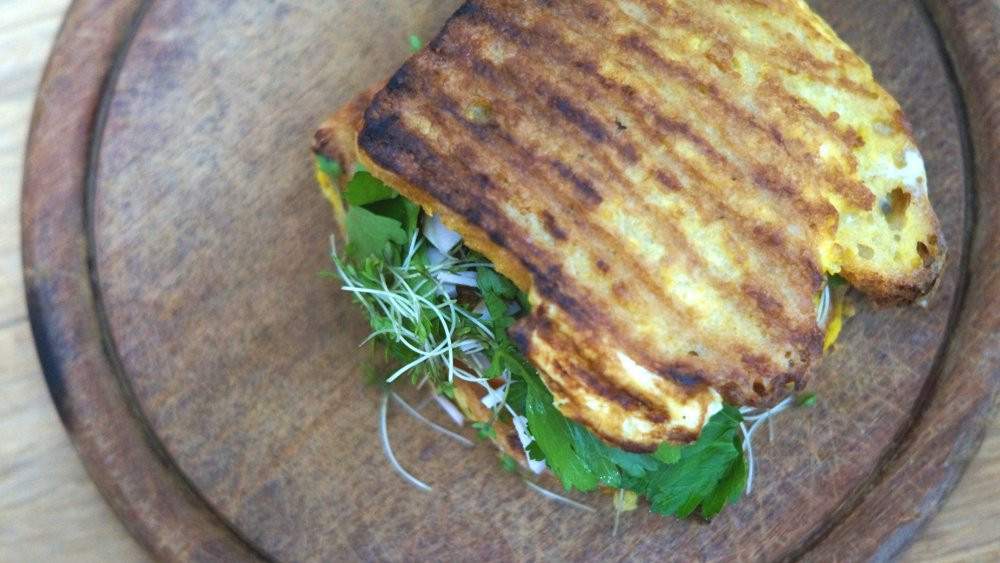 Das Brot in etwa ½ cm dicke Scheiben schneiden, kurz in die Eimasse geben und dann in der Pfanne goldbraun ausbraten. Kresse, Petersilie und Putenschinken grob hacken und in eine Schüssel geben. Den Käse fein reiben und beiseite stellen.