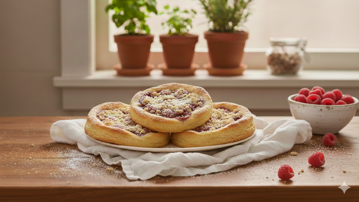 Die Himbeeren (o. a. Beeren) waschen, halbieren und auf den Talern verteilen. Anschließend die Streusel auf den Talern verstreuen. Bei 200 °C Ober-/Unterhitze für 15 - 20 Minuten im Ofen backen.