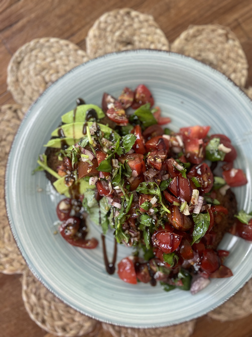 Anrichten: Die Brotscheiben aus der Pfanne nehmen. Die Avocado quer aufschneiden (mit einem Messer einritzen) und mit dem Löffel aushöhlen. Die Avocado in Scheiben auf das Brot drapieren oder verstreichen. Dann die Tomaten-Basilikum-Mischung auf dem Avocadobrot verteilen. Mit Balsamicocreme garnieren.