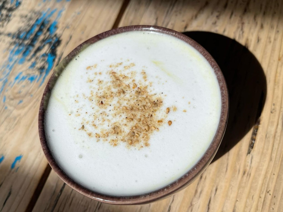Die Kokosmilch erwärmen und aufschäumen – entweder mit einem Milchaufschäume oder Mixer.
