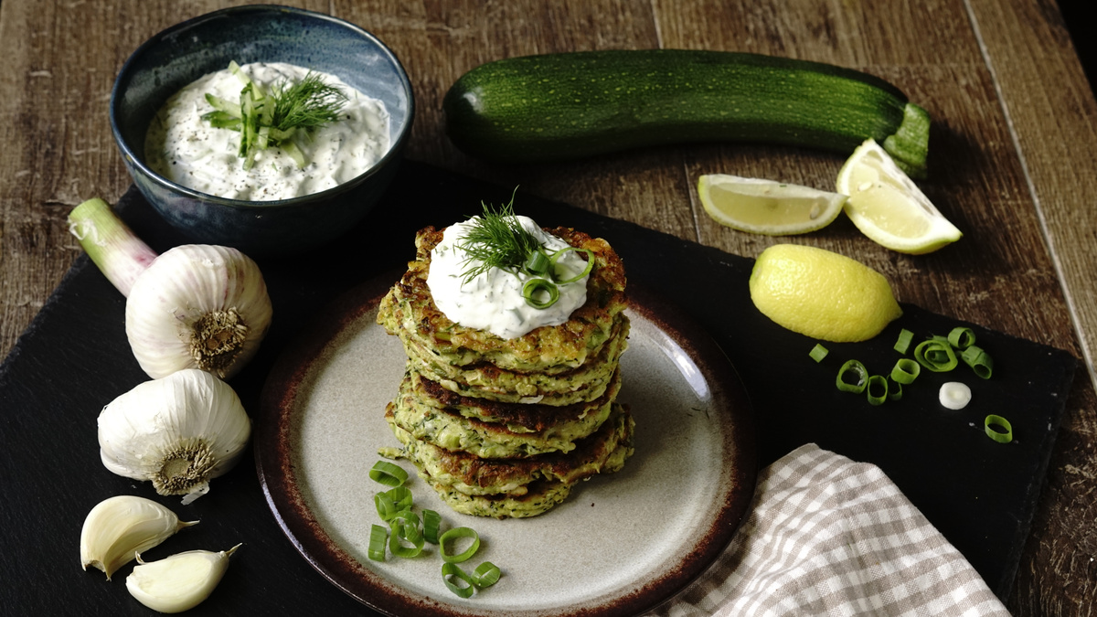 In einer Pfanne 2 EL Bratöl auf mittlerer Stufe erhitzen, die Zucchini-Masse mit Abstand zueinander mit einem Esslöffel in die Pfanne geben, etwas platt drücken und von jeder Seite goldbraun braten; nach Bedarf Öl nachgeben. Je nach Pfannengröße benötigt man mehrere Etappen, fertige Puffer ggf. auf einem Teller im Backofen warmhalten, bis alle Puffer fertig sind. Mit Tsatsiki servieren.